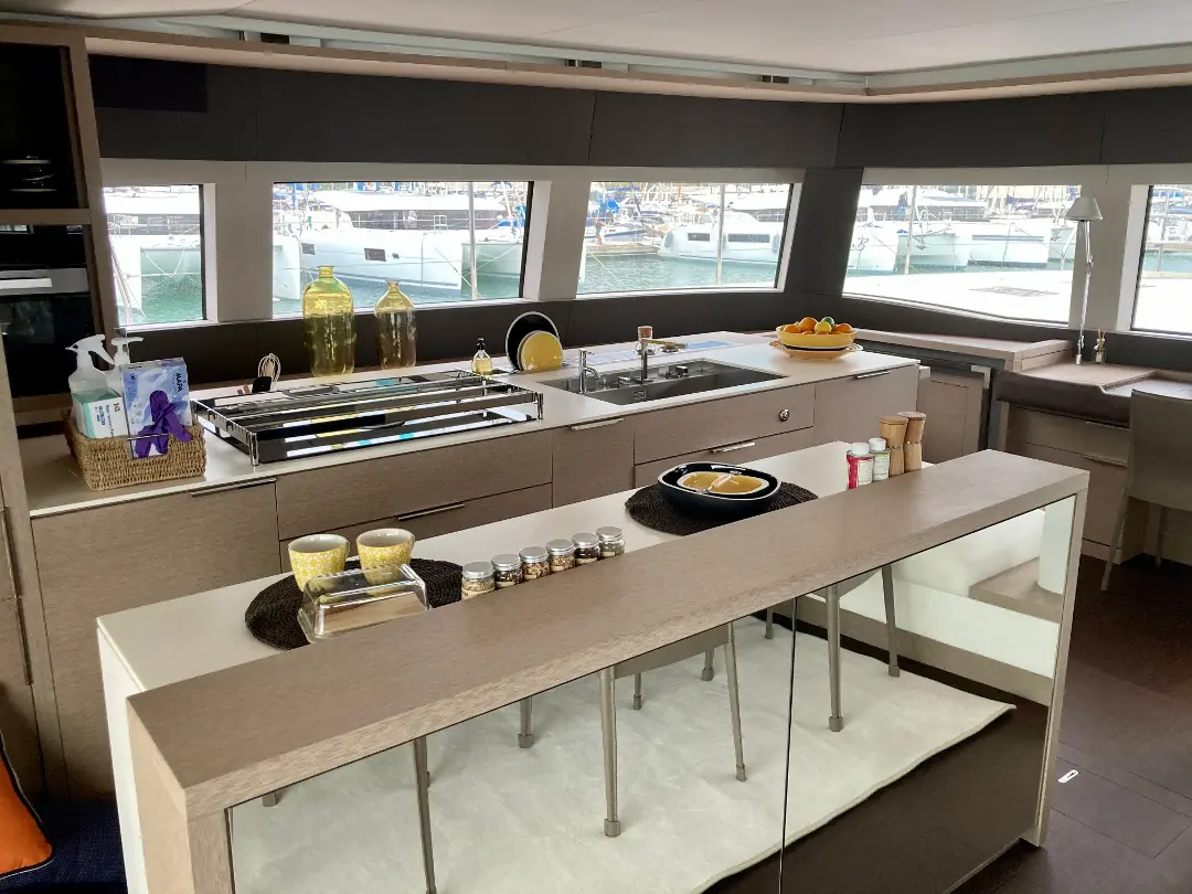 When on-board the Lagoon SIXTY 5, you have a clear view through fore to aft and impressive 360° views, thanks to the famous ‘wraparound’ windows.The saloon is bright, spacious and has a colour palette of grey oak, beige and warm tones which emphasise the luxury, space and flow of the Lagoon SIXTY 5. The saloon includes a large dining table, sofa and lounge area with a coffee table.