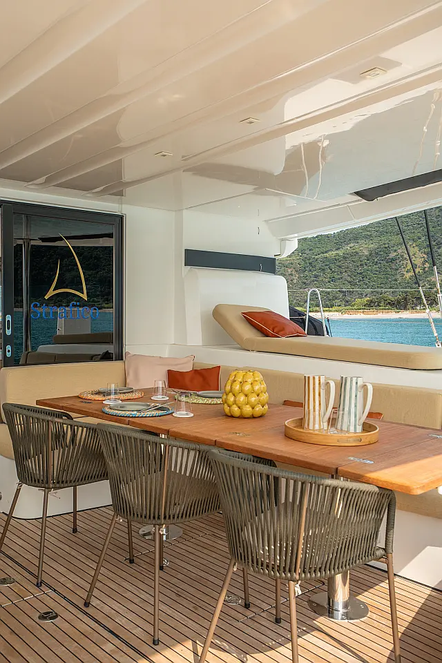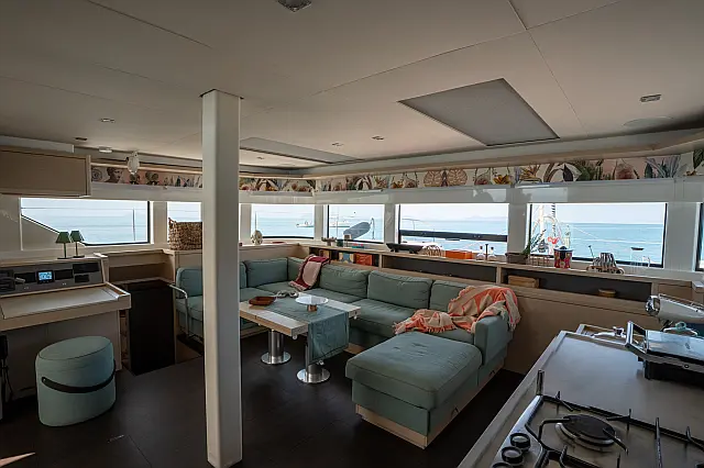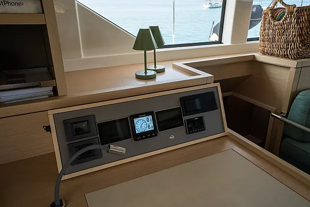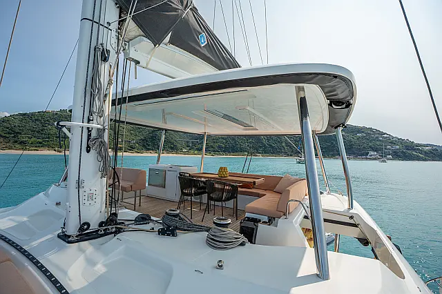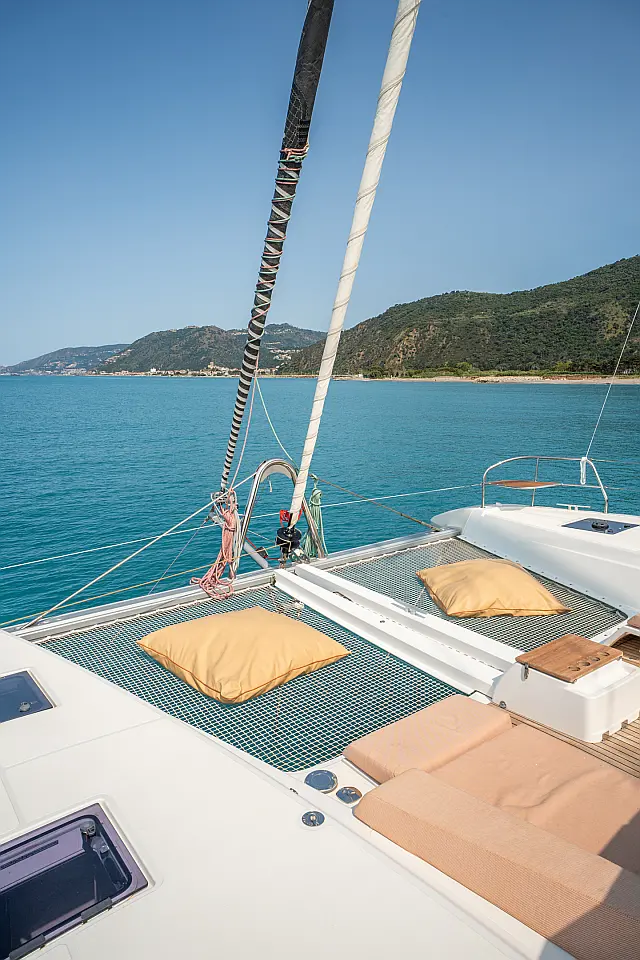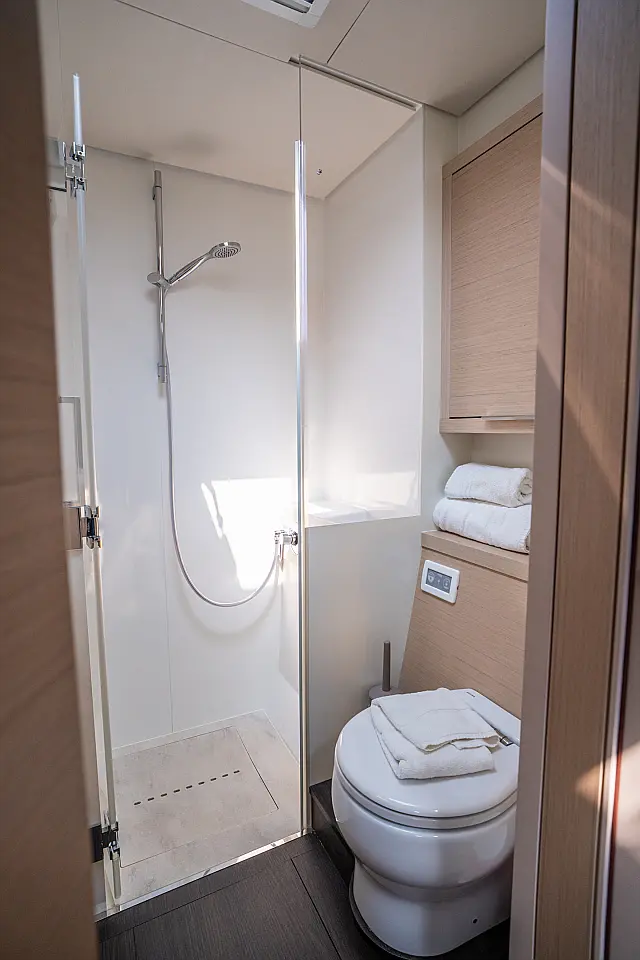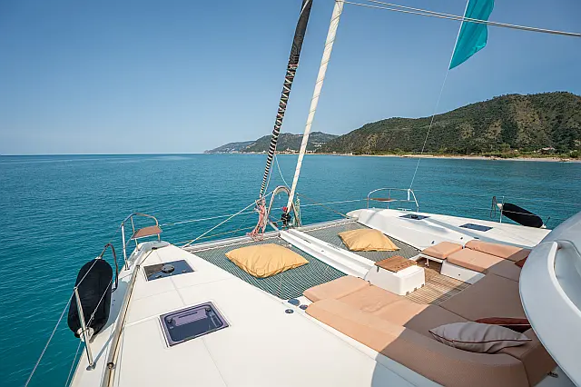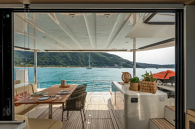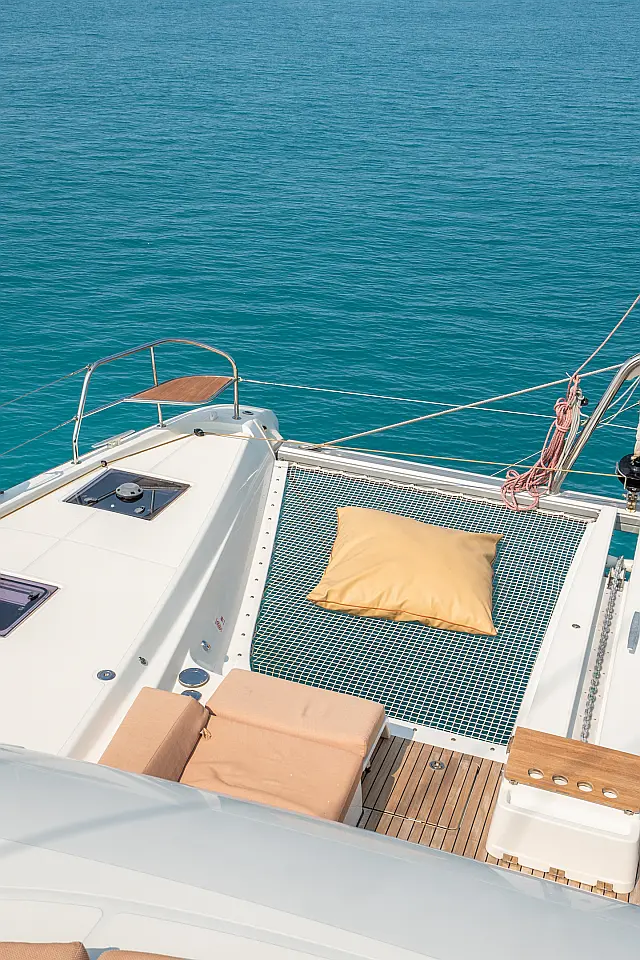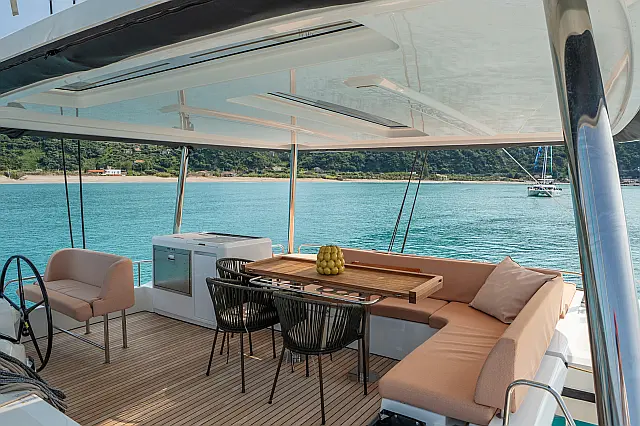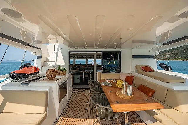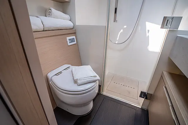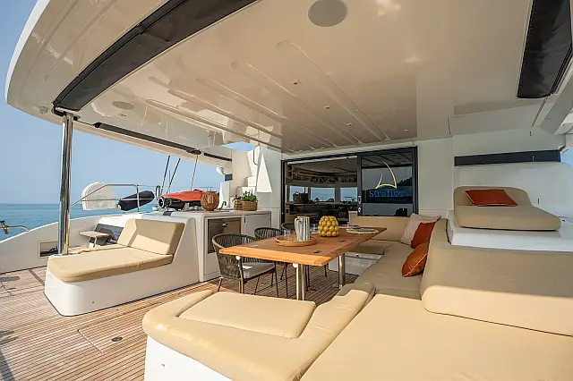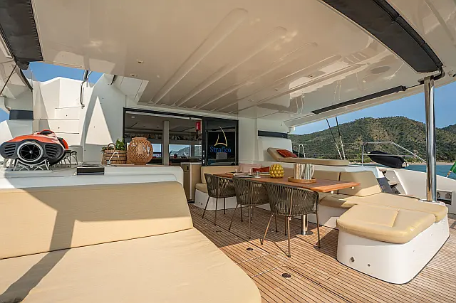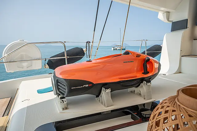 Dinghy , Outboard engine , Teak Cockpit , Refrigerator , Flybridge , Air condition , Cockpit speakers , Water maker , Hydraulic gangway , Barbecue grill in cockpit , Inverter , Coffee maker , Generator , Electric toilet