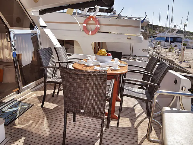 Hydraulic gangway , Refrigerator , Wi-Fi & Internet , Flybridge , Teak Cockpit , Heating , Dinghy , Coffee maker