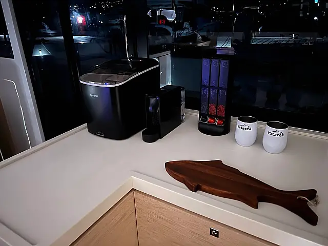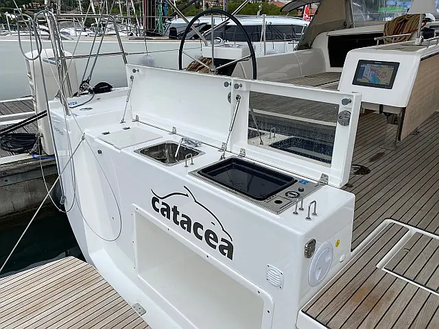 Air condition , Teak Cockpit , Sprayhood , Bimini , Outboard engine , Barbecue grill in cockpit , Solar Panels